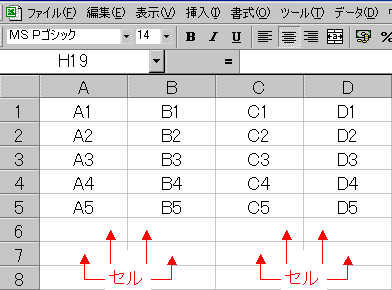 【図1−2】の一つ一つのセル(A1〜D5)がExcelの住所に成ります。