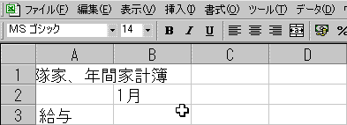 A列に項目の文字が入った所で、今度は2行目に1月〜3月と合計の文字を入力しましょう。