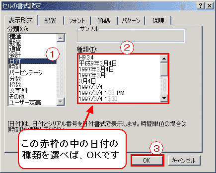 出てきた”セルの書式設定”の<表示形式>を選択します。 |